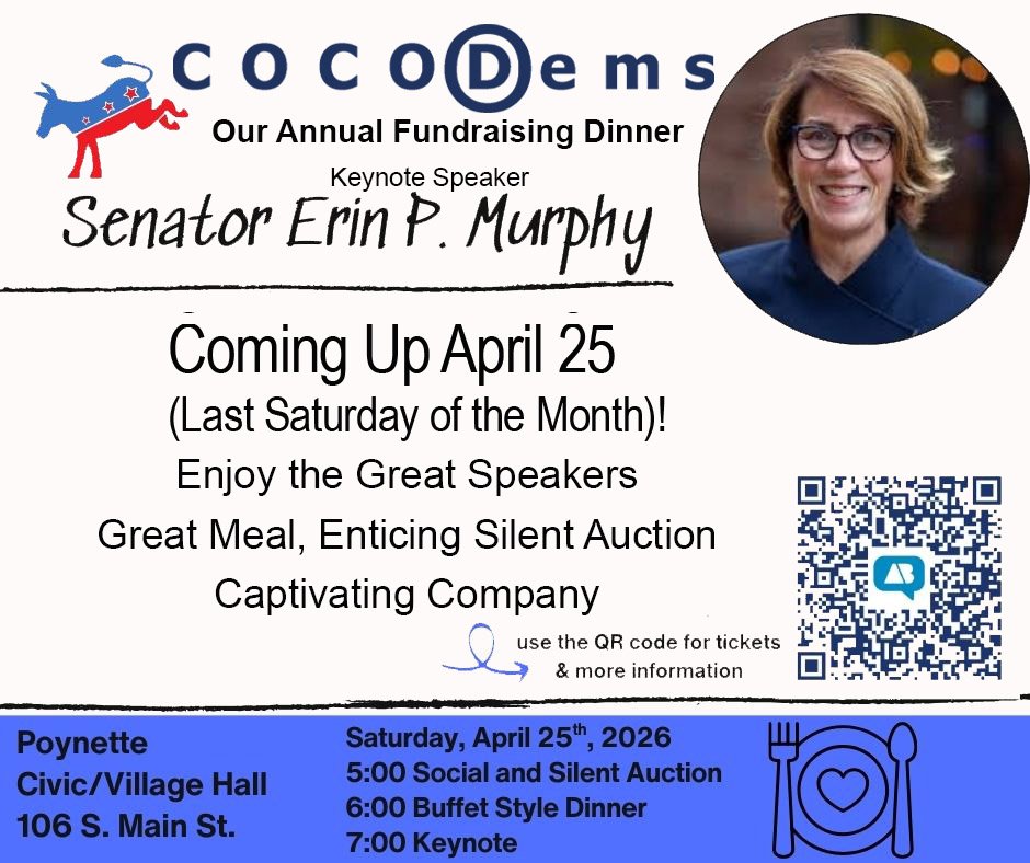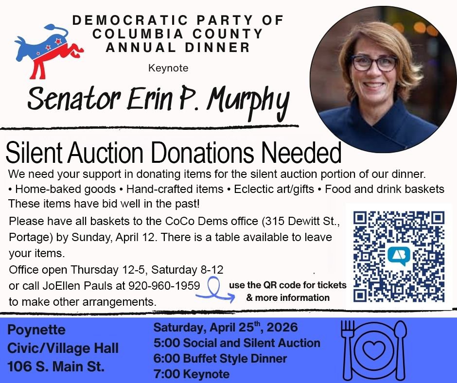 SILENT AUCTION DONATIONS! We need your support in donating items for the silent auction portion of our dinner. Home baked goods, handcrafted items, eclectic art/ gifts, food and drink baskets are some ideas of what has bid well in the past. Please have all baskets to the CoCoDem office by Sunday, April 12th. There is a table, labeled silent auction donations, set up to place items. The office is open Thursday from 12-5 and Saturday from 8-12. If you need to make other arrangements, please contact JoEllen Pauls 920.960.1959